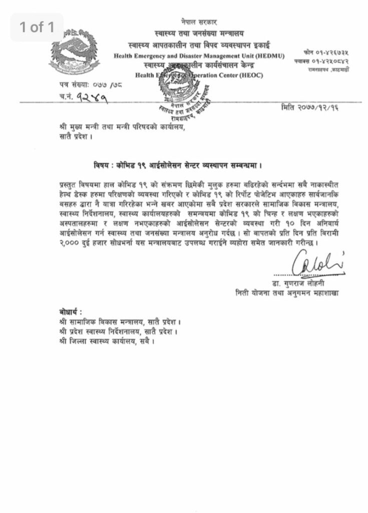 लक्षण देखिएका संक्रमितलाई अस्पताल र नदेखिएकाहरुलाई पनि १० दिन अनिवार्य आइसोलेसन सेन्टरमा राख्न मन्त्रालयको निर्देशन छ ।आइसोलेसन सेन्टरमा राखेबापत प्रतिव्यक्ति दुई हजार रुपैयाँका दरले सोधभर्ना रकम उपलब्ध गराउने समेत मन्त्रालयले जनाएको छ ।