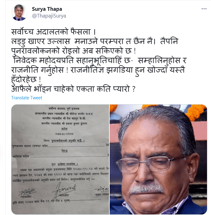 प्रधानमन्त्री केपी शर्मा ओलीका प्रेस सल्लाहकार सूर्य थापाले तुच्छ र अमानवीय टिप्पणी गरेका छन् । नेकपाको नामसम्बन्धि मुद्दामा सर्वाैच्च अदालतले माओवादी केन्द्रका अध्यक्ष प्रचण्डले दिएको पनुरावलोकन निवेदन खारेज गरिदिएपछि थापाले प्रचण्डलाई सहानुभुती दिएका छन् । छोरा प्रकाशको निधनमा प्रचण्ड रोएको तस्वीर राखेर थापाले तुच्छ टिप्पणी गरेका हुन् ।
