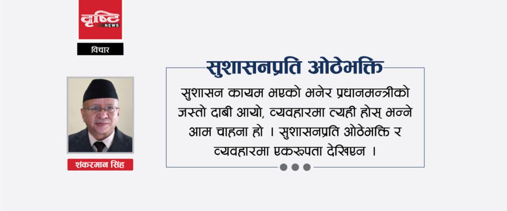 सुशासन कायम भएको भनेर प्रधानमन्त्रीको जस्तो दाबी आयो, व्यवहारमा त्यही होस् भन्ने आम चाहना हो । सुशासनप्रति ओठेभक्ति र व्यवहारमा एकरूपता देखिएन ।