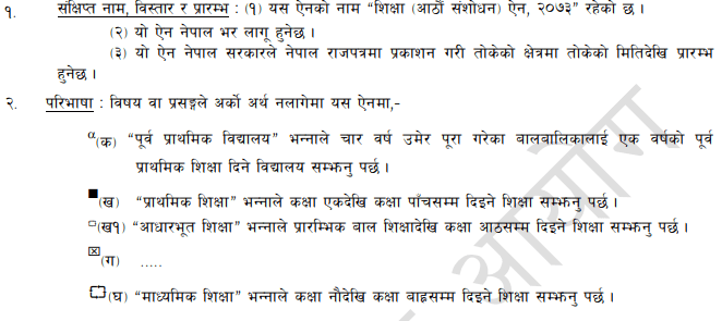 तर ०७३ सालमा गरेको शिक्षा ऐनको आठौं संशोधनले कक्षा १० सम्मको शिक्षालाई माध्यमिक शिक्षा भनिने गरेको पहिलाको शिक्षा पद्धतिमा ठुलो परिवर्तन गरेर कक्षा नौ देखि कक्षा १२ सम्मको शिक्षालाई माध्यमिक शिक्षा भन्ने नयाँ निर्णय कानून म लागु गरिसकेको छ ।