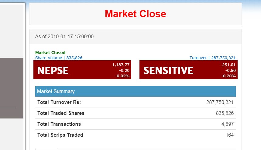 काठमाडौँ । धितोपत्र बजारमा आज शेयरको मूल्य झिनो अंकले मात्रै घटेको छ । नेपाल स्टक एक्सचेञ्जका अनुसार कारोवार मापक नेप्से परिसूचक ०.२ विन्दुले घटेर एक
