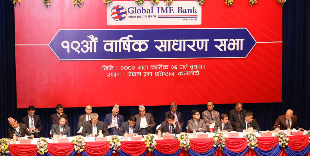 काठमाडौं । ग्लोबल आइएमई बैंक लिमिटेडको १९औँ वार्षिक साधारणसभा बुधबार काठमाडौँमा सम्पन्न भएको छ । साधारणसभाले आर्थिक वर्ष २०८१/८२ को सञ्चित मुनाफा समेतबाट बैंकले आफ्ना