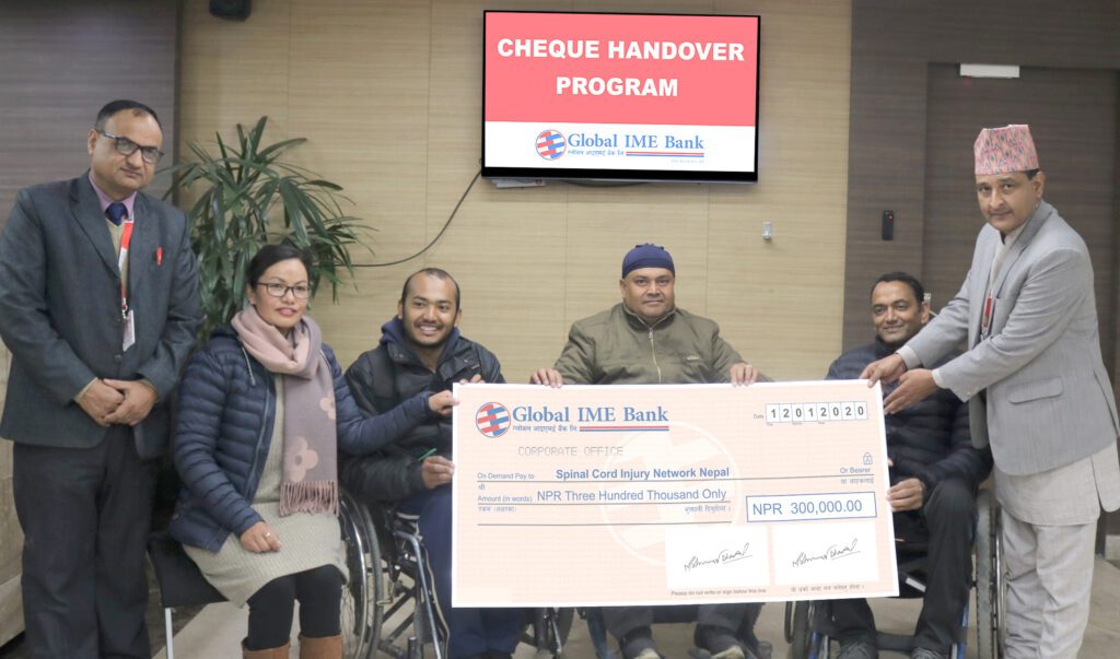 काठमाडौं । ग्लोबल आइएमई बैंक लिमिटेडले संस्थागत सामाजिक उत्तरदायित्वअन्तर्गत मेरुदण्डीय पक्षघात समूह नेपाललाई रु ३ लाख रुपैंया सहयोग गरेको छ । आइतबार आयोजित एक कार्यक्रममा