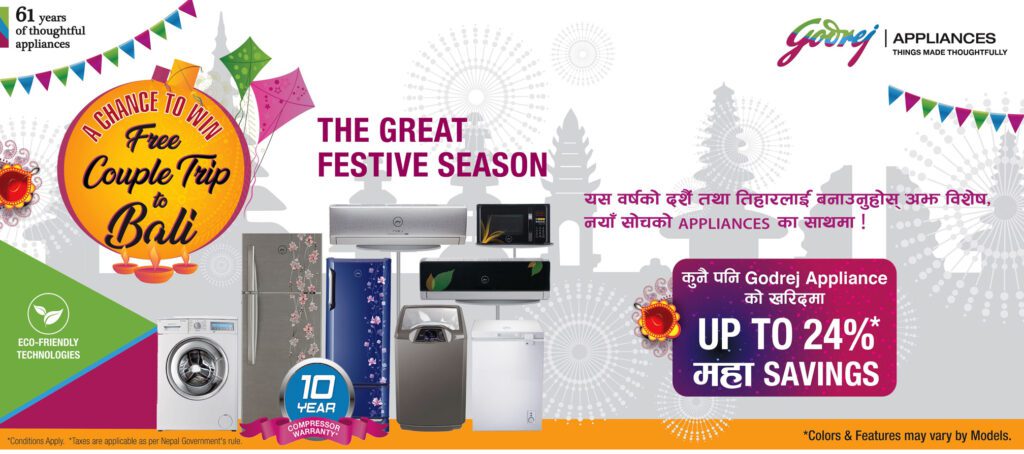 काठमाडौं । गोदरेज अप्लाएन्सेस्ले चाडपर्वहरुको अवसरमा ग्राहकहरुमाझ अझ धेरै खुशी व्यक्त गर्न “फ्रि कपल ट्रिप टु बाली” अफर ल्याएको छ । यो योजना अन्र्तगत गोदरेजले