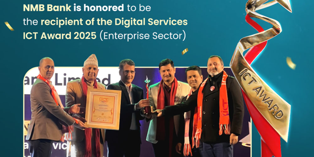 काठमाडौं । एनएमबि बैंक लिमिटेडले ‘डिजिटल सर्भिसेज आइसिटी अवार्ड–२०२५ (इन्टरप्राइज क्षेत्र) प्राप्त गरेको छ । बैंकले डिजिटल रूपान्तरणमार्फत उत्कृष्ट सेवा प्रवाह गरेबापत यो अवार्ड पाएको