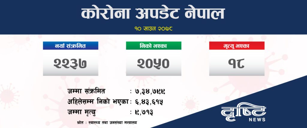 काठमाडौं । नेपालमा थप २ हजार २ सय ३७ जनामा कोरोना भाइरसको संक्रमण पुष्टि भएको छ । स्वास्थ्य तथा जनसंख्या मन्त्रालय गत २४ घण्टामा पीसीआर