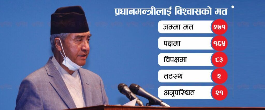 काठमाडौं । नेपाली कांग्रेसका सभापति शेरबहादुर देउवाले बहुमत सांसदको विश्वास पाएका छन् । पुर्नस्थापित प्रतिनिधिसभाको बैठकमा प्रधानमन्त्री देउवाले गरेको विश्वासको मतको परीक्षणमा बहुमत अर्थात् १