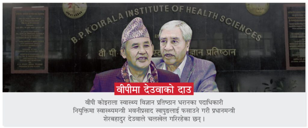 धरान । वीपी कोइराला स्वास्थ्य विज्ञान प्रतिष्ठानका पदाधिकारी नियुक्तिमा स्वास्थ्य मन्त्री भवनाप्रसाद खापुङलाई फसाउने गरी प्रधानमन्त्री शेरबहादुर देउवाले चलखेल गरिरहेका छन् । रिक्त रजिष्ट्रार, अस्पताल