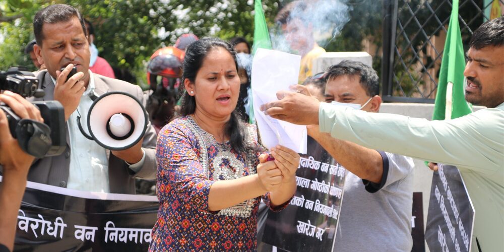 काठमाडौं । स्थानीय समुदाय, महिला तथा संघीयता विरोधी रहेको भन्दै सामुदायिक वन उपभोक्ता महासंघ (फेकोफोन)ले वन नियमावली जलाएको छ । मंगलबार वन परिसरमा विरोध प्रदर्शन