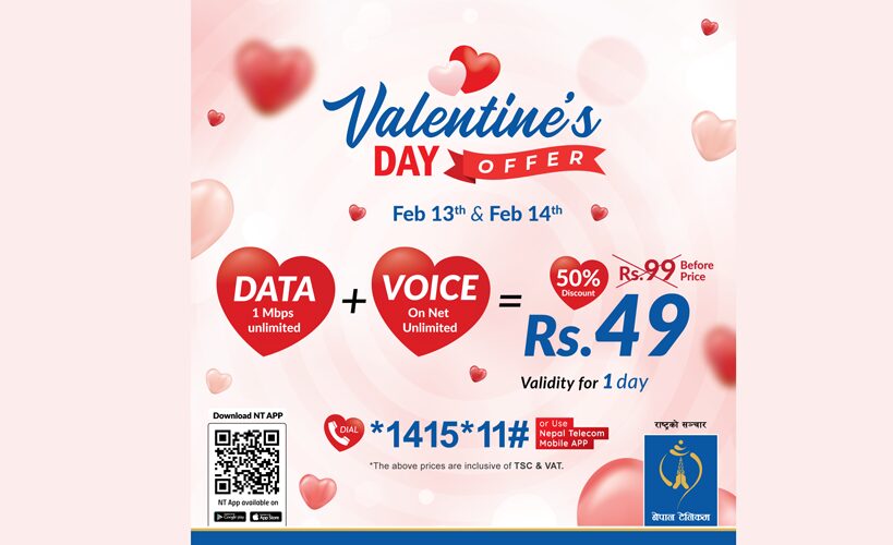 काठमाडौं । नेपाल टेलिकमले ‘भ्यालेन्टाइन डे’को अवसरमा नयाँ अफर ल्याएको छ । भ्यालेन्टाइनको अवसरमा कम्पनीले अनलिमिटेड डेटा र भ्वाइससहितको नयाँ अफर सार्वजनिक गरेको हो ।