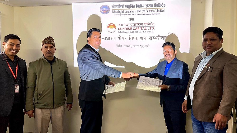 काठमाडाैं । धौलागिरी लघुवित्त वित्तीय संस्था लिमिटेडले ३ लाख कित्ता साधारण शेयर निष्काशन गर्नको लागि सनराइज क्यापिटल लिमिटेडलाई निष्काशन तथा बिक्री प्रबन्धकमा नियुक्त गरेको छ