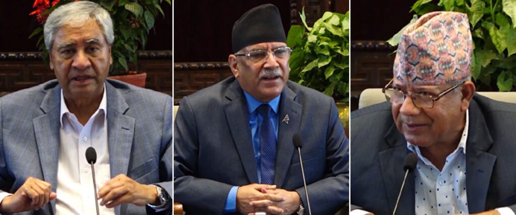 काठमाडौं । प्रधानमन्त्री शेरबहादुर देउवा, नेकपा माओवादी केन्द्रका अध्यक्ष पुष्पकमल दाहाल ‘प्रचण्ड’ र नेकपा एकीकृत समाजवादीका अध्यक्ष माधवकुमार नेपालबीच आज पनि भेटवार्ता भएको छ ।