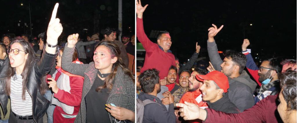 काठमाडाैँ । प्रतिनिधिसभा पुनःस्थापनाको खुसियालीमा काठमाडौंमा युवाहरुले जुलुस निकालेका छन् । काठमाडौंका विभिन्न स्थानमा अहिले युवाहरुले जुलुस निकालेका छन् । स्राेत : सामाजिक