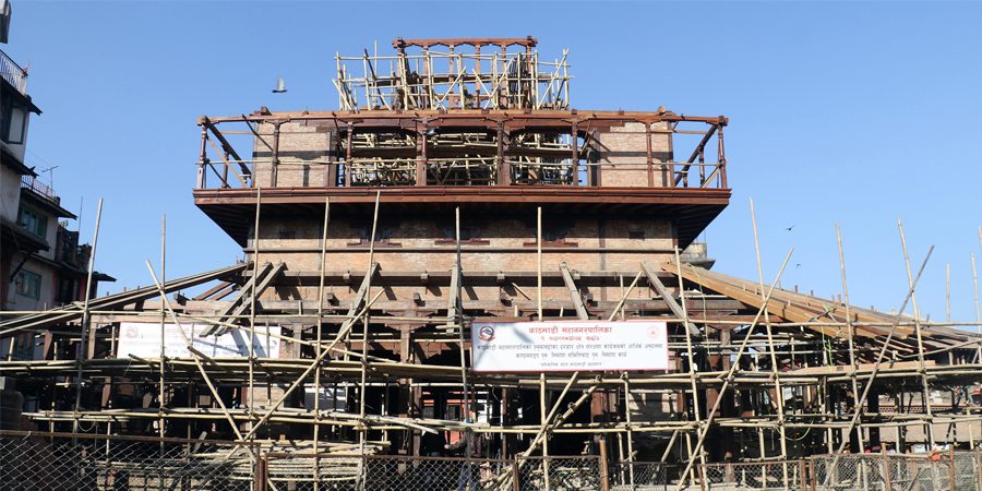 काठमाडौं । निषेधाज्ञामा पनि ऐतिहासिक सम्पदा काष्ठमण्डप पुनःनिर्माणको काम नियमित भइरहेको छ । हाल दैनिक ३० कामदारले नियमित काम गरिरहेको उक्त सम्पदाको पुनःनिर्माण गर्नका लागि