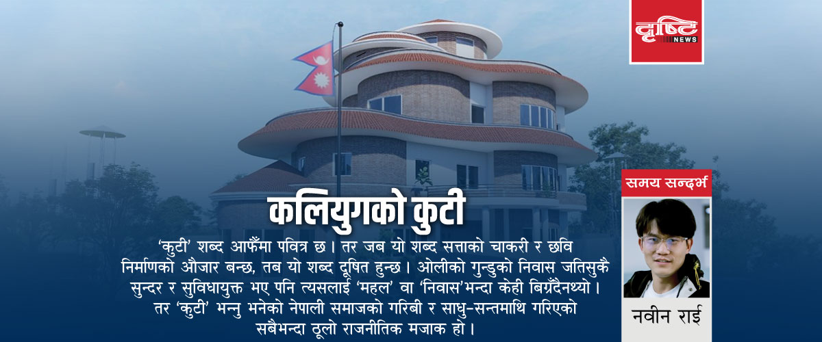 ‘कुटी’ शब्द सुन्नसाथ हाम्रो मानसपटलमा एउटा आद्य–प्रतिमा जागृत हुन्छ-जंगलको छेउ, नदीकिनार, वनको बीच एकान्तमा बनेको सानो झुपडी । जहाँ साधुसन्त बस्छन् । मन्त्र-जप हुन्छ ।