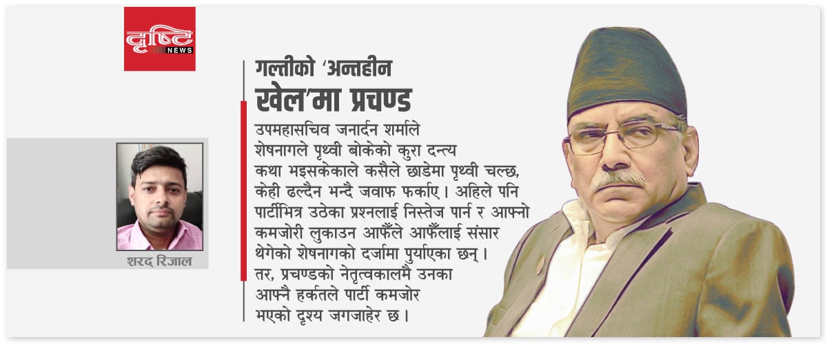 नेकपा(माओवादी केन्द्र)का अध्यक्ष पुष्पकमल दाहाल प्रचण्डले आफ्नो निष्कर्ष विपरीत राजनीतिक घटनाक्रम विकसित भएपछि विगतका निर्णयको विरोधाभाष उत्पन्न हुने गरी नयाँ निष्कर्षमा पुगेका छन् । सरकारको