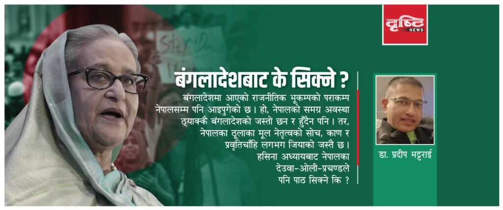 नेपालबाट भौगोलिक रूपमा १४ माइल मात्र टाढा रहेको बंगलादेशमा राजनीतिक भूकम्प गयो । पूर्वानुमान नै गर्न नसकिएको यो भूकम्पले शेख हसिनालाई एक शक्तिशाली प्रधानमन्त्रीबाट रातारात