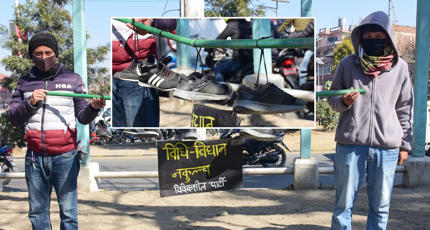 काठमाडौं, २६ माघ । संसद विघटन र संसदीय सुनुवाईविनै संवैधानिक आयोगमा भएको पदाधिकारीको नियुक्तिविरुद्ध विवेकशील नेपाली दलले राजनधानीमा प्रदर्शन गरेको छ । ‘विधि विधान नकुल्च’