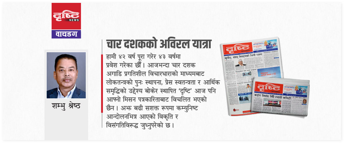 यो अंकदेखि हामी ४२ वर्ष पूरा गरेर ४३ वर्षमा प्रवेश गरेका छौँ । आजभन्दा चार दशक अगाडि प्रगतिशील विचारधाराको माध्यमबाट लोकतन्त्रको पुनः स्थापना, प्रेस स्वतन्त्रता