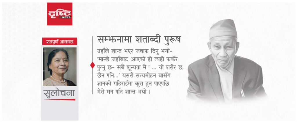 सत्यमोहन बाको भर्खरै निधन भयो । ‘वाङ्मय शताब्दी पुरुष’का रूपमा सर्वत्र परिचित उहाँ यथार्थमा सम्यक जीवन बाँच्न सिकाउने कुशल जीवनगुरू हुनुहुन्थ्यो । १०३ वर्षको लामो