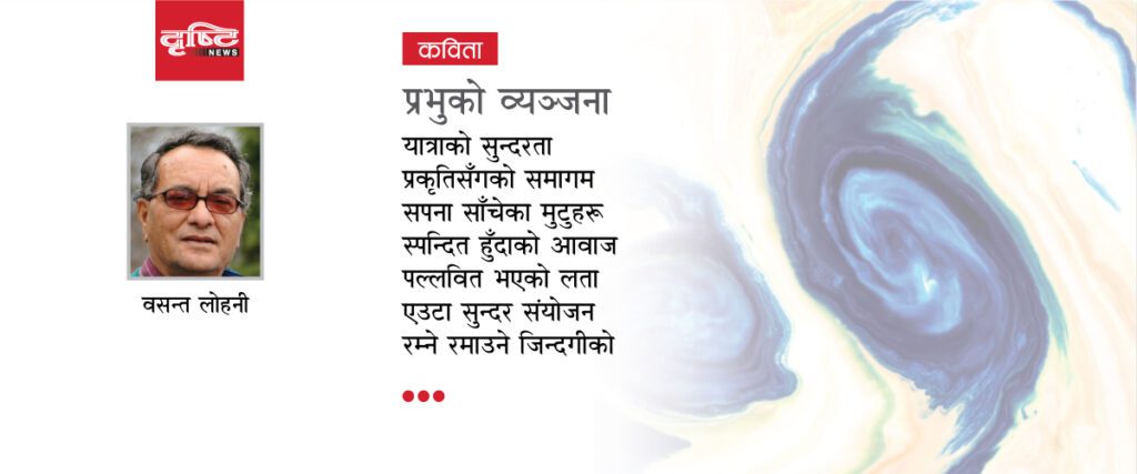 अनन्त संयोजनप्रत्येक संयोजन मौलिक छप्रभुको व्यञ्जना यात्राको सुन्दरताप्रकृतिसँगको समागमसपना साँचेका मुटुहरूस्पन्दित हुँदाको आवाजपल्लवित भएको लताएउटा सुन्दर संयोजनरम्ने रमाउने जिन्दगीको व्यञ्जना प्रभुको अनन्तत्यति नै विविधसबै मिठो