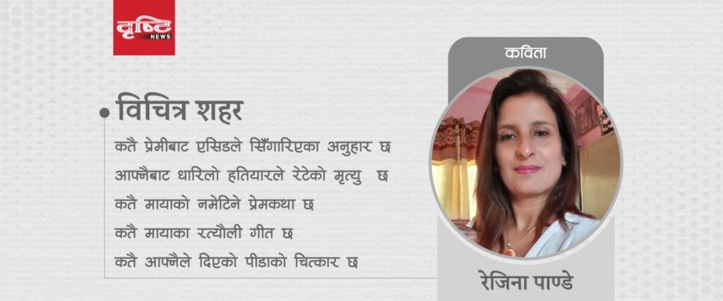 कति भीड छ यो शहरजताततै मान्छेको आहोर–दोहोर छयता पनि आफ्नै मान्छेसँग ठेस लाग्छउत्ता पनि आफ्नै मान्छेसँग ठोकिन्छचहल–पहलको शहर कति बिचित्रको छ । मैन जस्तै पग्लेका