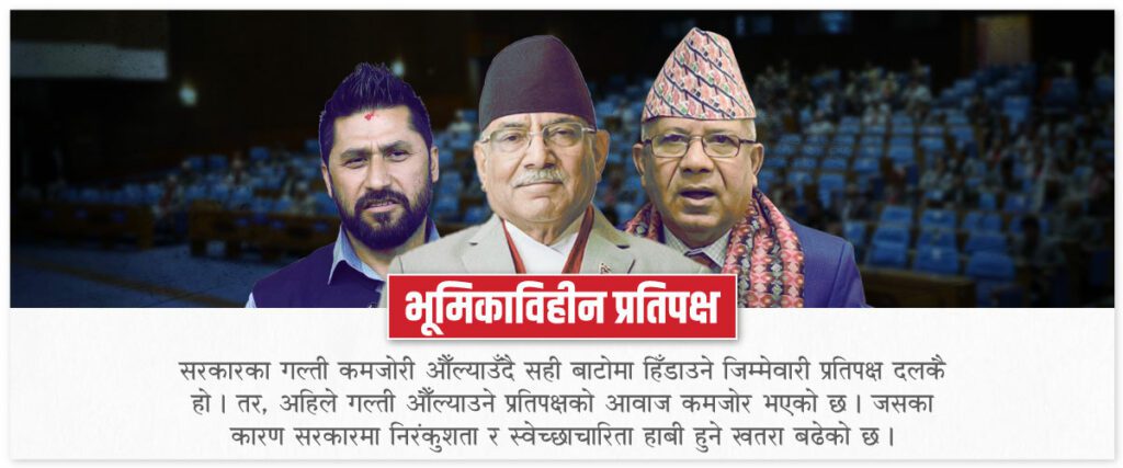 काठमाडौं । संसदीय शासन व्यवस्थामा प्रमुख प्रतिपक्ष दल सरकारको विकल्प हो । त्यसैले प्रमुख प्रतिपक्ष दललाई ‘वेटिङ गभर्मेन्ट’ र त्यसको नेतालाई ‘वेटिङ प्राइमिनिस्टर’को रुपमा लिइन्छ