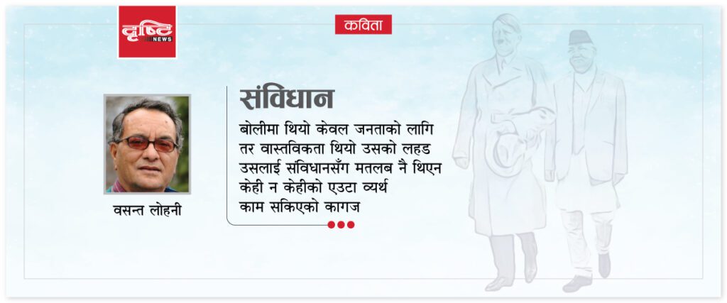 संविधान सत्तामा पुग्नेर, सत्तामा टिक्ने एउटा दस्ताबेजत्यो भन्दा केही भएनएउटा निर्जीव पारिएको दस्ताबेजन त्यसको शब्दन त्यसको मर्महिफाजत भयोत्यसैलाई विरूप बनाएरआफ्नो स्वरूप सुन्दर पार्नेअनवरत कसरत मसिहाहरूको