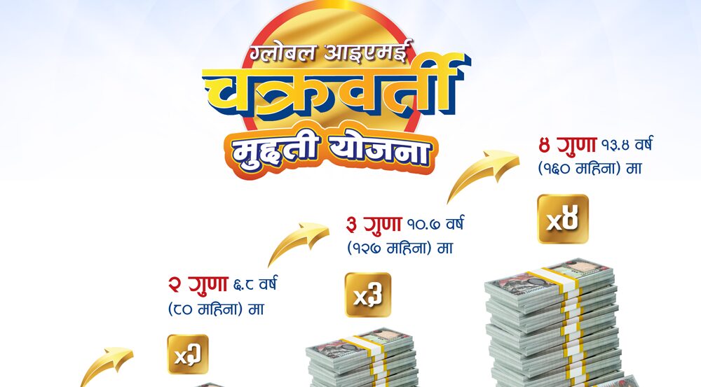 काठमाडौं । ग्लोबल आइएमई बैंक लिमिटेडले ग्राहकहरुको मुद्दती निक्षेपलाई दोब्बर, तेब्बर, चौबर वा सोहीअनुसार बनाउन सकिने ‘ग्लोबल आइएमई चक्रवर्ती मुद्दती योजना’ सार्वजनिक गरेको छ ।
