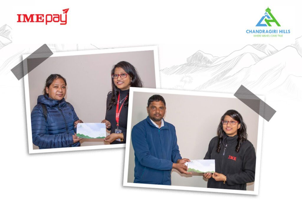 काठमाडौं । आइएमई पेले प्रणय दिवसका अवसरमा ल्याएको अफरअन्तर्गत हवाई टिकट बुकिङ गर्ने दुई जोडीले चन्द्रागिरि रिसोर्टमा एक रात दुई दिनको प्याकेज जितेका छन् ।