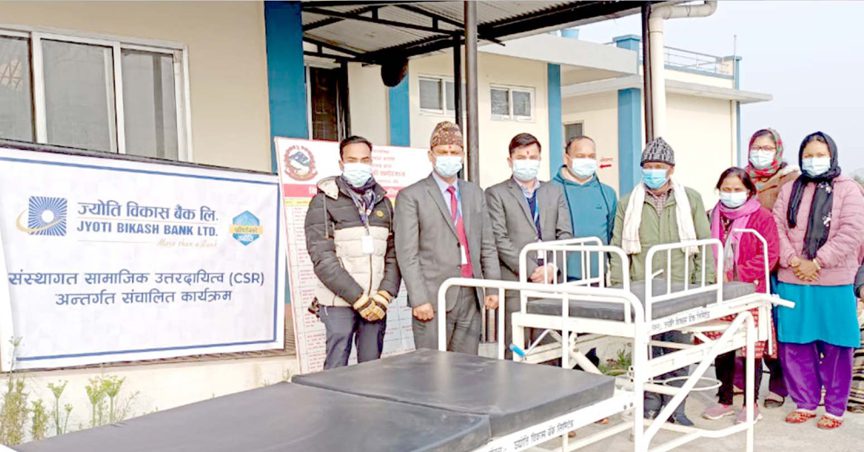 काठमाडौं । ज्योति विकास बैंकले दुई संस्थालाई सहयोग गरेको छ । बैंकले संस्थागत सामाजिक उत्तरदायित्वअन्तर्गत बाँकेको कोहलपुर नगरपालिकामा रहेको शम्शेरगन्ज स्वास्थ्यचौकीको बर्थिङ सेन्टरलाई डेलिभरी बेड