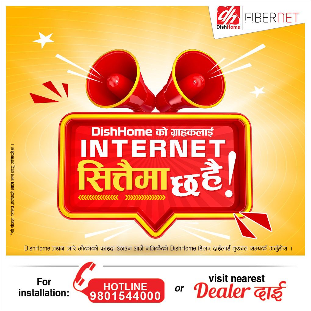 काठमाडौं । नेपालको एक मात्र डीटीएच सेवाप्रदायक कम्पनी डिशहोमले आफ्ना ग्राहकलाई निःशुल्क १० एमबीपीएस इन्टरनेट प्रदान गर्ने भएको छ । कम्पनीले यसअघि नै बजारमा ल्याएको