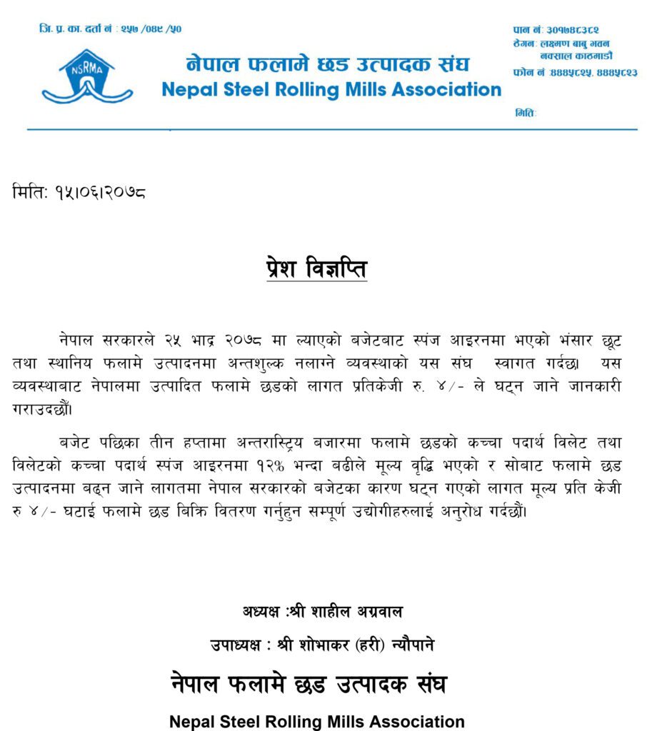 काठमाडौं । नेपाल फलामे छड उत्पादक संघले फलामे उत्पादनमा अन्तशुल्क नलाग्ने व्यवस्थाको स्वागत गरेको छ । संघका अध्यक्ष शाहीले आज (शुक्रबार) एक विज्ञाप्ति जारी गर्दै
