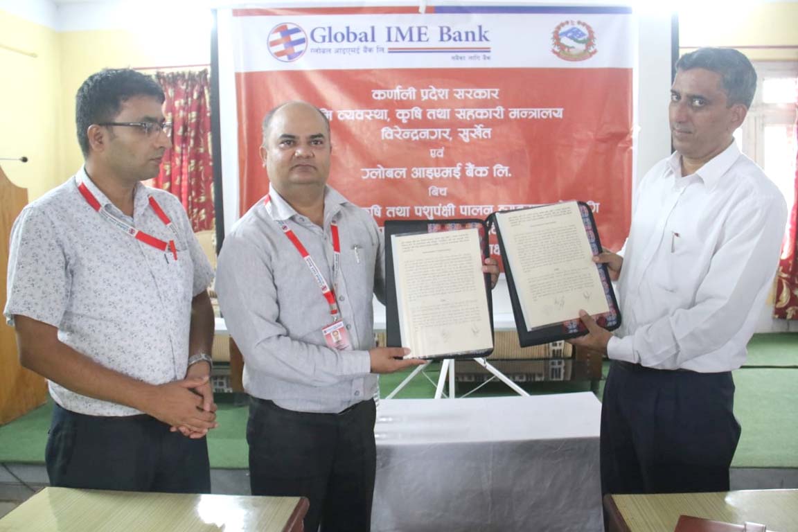काठमाडौं । ग्लोबल आइएमई बैंक लिमिटेड र भूमि, व्यवस्था, कृषि तथा सहकारी मन्त्रालय, कर्णाली प्रदेश, सुर्खेतबीच कर्णाली प्रदेशका व्यवसायिक कृषि तथा पशुपन्छी पालनमा संलग्न कृषकहरुलाई