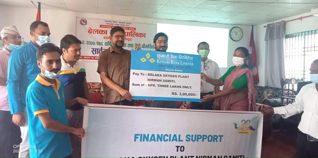 काठमाडौंं । कुमारी बैंक लिमिटेडले उदयपुरको बेलकामा निर्माणाधीन अवस्थामा रहेको अक्सिजन प्लान्टलाई रु ३ (तीन) लाख सहयोग गरेको छ । एक औपचारिक कार्यक्रमका बीच, बेलका