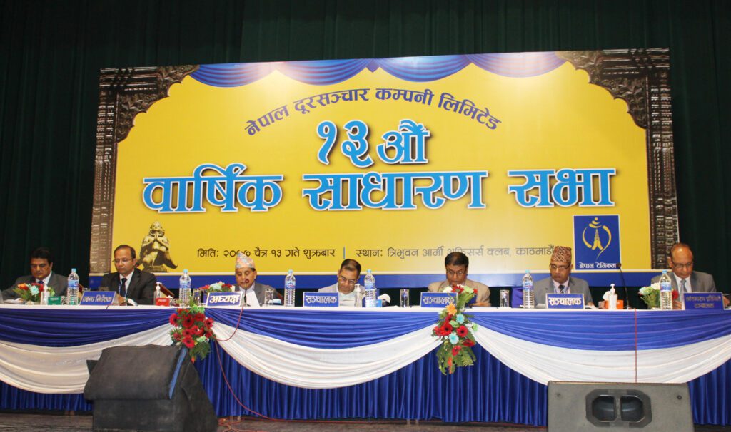 काठमाडौं । नेपाल दूरसञ्चार कम्पनी लिमिटेडको तेह्रौँ वार्षिक साधारणसभा चैत १३ गते सम्पन्न भएको छ । त्रिभुवन आर्मी अफिसर्स क्लब काठमाडौमा सम्पन्न साधारणसभाले आर्थिक वर्ष