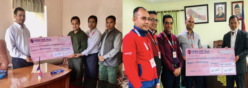 काठमाडौं । ग्लोबल आइएमई बैंकले कोरोना रोकथाम तथा नियन्त्रणका लागि कर्णाली र गण्डकी प्रदेश सरकारलाई १०/१० लाख रुपैंया सहयोग गरेको छ । बैंकको कर्णाली प्रदेशको