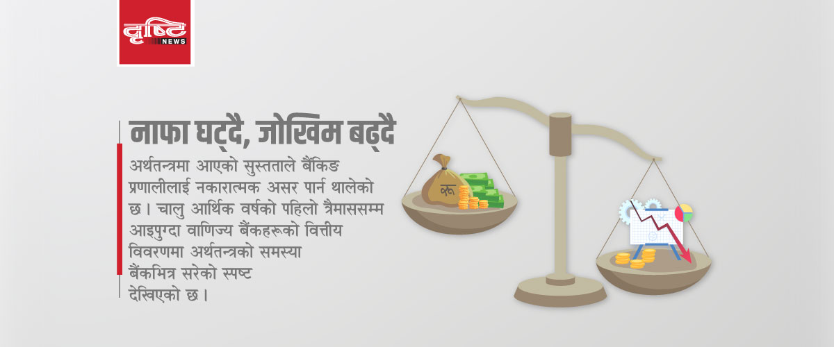 काठमाडौं । अर्थतन्त्रमा आएको सुस्तताले बैंकिङ प्रणालीलाई नकारात्मक असर पार्न थालेको छ । चालु आर्थिक वर्षको पहिलो त्रैमाससम्म आइपुग्दा वाणिज्य बैंकहरूको वित्तीय विवरणमा अर्थतन्त्रको समस्या