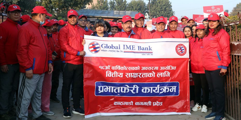 काठमाडौं । ग्लोबल आइएमई बैंक लिमिटेडले आफ्नो १८औँ वार्षिकोत्सवको अवसरमा सोमबार देशव्यापी प्रभातफेरि कार्यक्रमको आयोजना गरेको छ । आम जनमानसमा वित्तीय साक्षरता तथा बैंकिङ्ग सचेतना