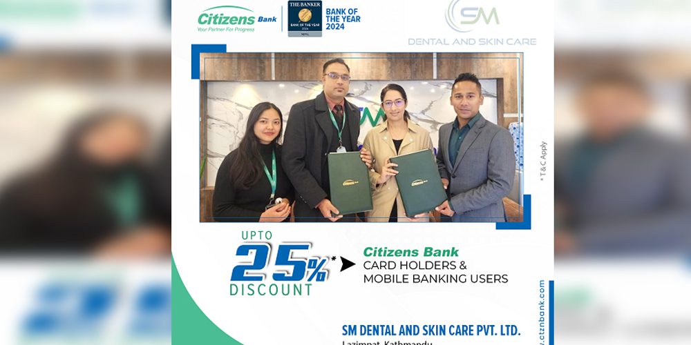 काठमाडाैं । सिटिजन्स बैंक र एस एम डेन्टल एण्ड स्किन केयर प्रालिबीच बैंकका ग्राहकलाई छुट दिने समझदारी हस्ताक्षर भएको छ । यो सँगै बैंकका कार्डबाहक