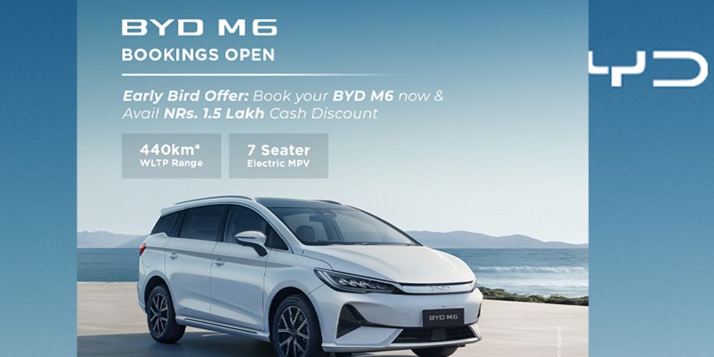 काठमाडौं । बीवाईडी एम६ को बुकिङ खुला भएको छ । नेपालका लागि बीवाईडीको आधिकारिक वितरक साइमेक्स इंकले बीवाईडी एम६ को बुकिङ खुला गरेकाे जनाएकाे हाे