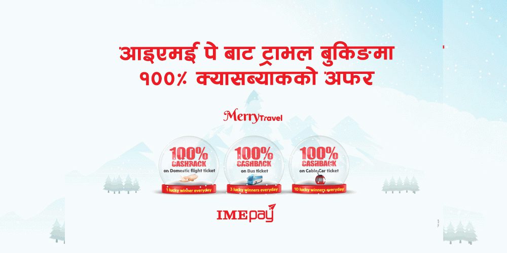 काठमाडौं । डिजिटल वालेट ‘आईएमई पे’ले क्रिसमस र नयाँ वर्ष २०२५ को अवसर पारी ट्राभल बुकिङमा १०० प्रतिशत क्यासब्याक अफर ल्याएको छ । कम्पनीले क्रिसमस