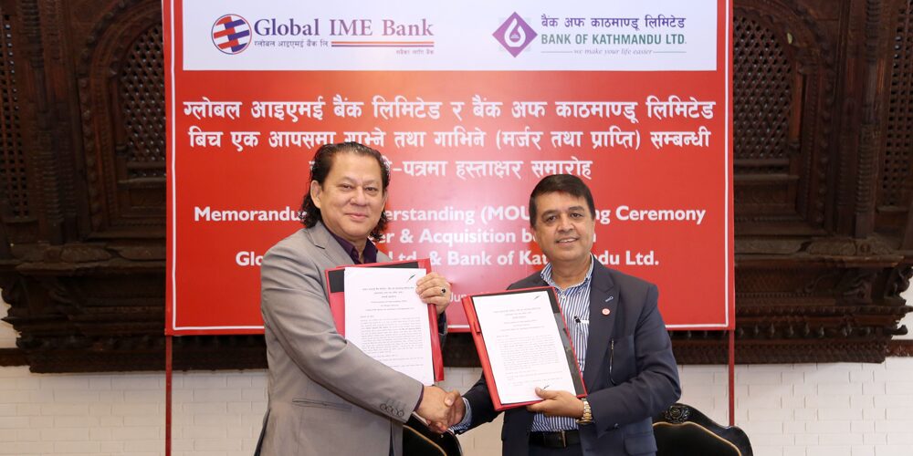 काठमाडौं । ग्लोबल आइएमई बैंक लिमिटेड र बैंक अफ काठमाण्डू लिमिटेड (बीओके)बीच एक आपसमा गाभ्न गाभिनका लागि बिहीबार प्रारम्भिक समझदारी पत्रमा हस्ताक्षर भएको छ ।
