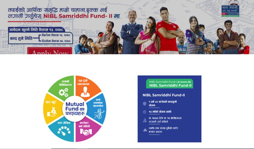 काठमाडौं । एनआईबिएल एस क्यापिटलले बिक्रीमा ल्याएको ‘एनआईबिएल समृद्धि फण्ड–२’ का लागि दोस्रो दिनमै ८७ प्रतिशतभन्दा बढी आवेदन परेको छ । क्यापिटलले बैशाख १३ गतेदेखि