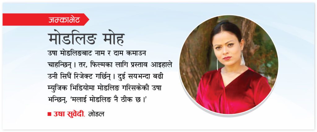 अधिकांश मोडल म्युजिक भिडियोबाट फिल्ममा फड्को मार्ने गर्छन् । कला क्षेत्रमै करिअर बनाउन चाहनेका लागि त्यो उपयुक्त विकल्प पनि हो । तर, उषा सुवेदी मोडलिङमै