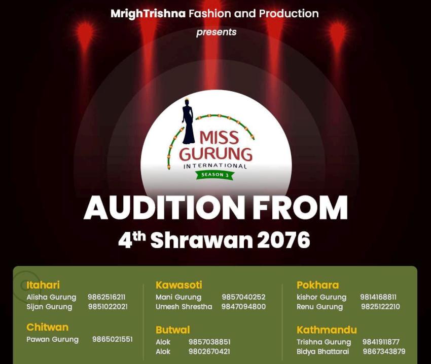 काठमाडौं, १४ असार । ‘मिस गुरुङ इन्टरनेशनल–२०१९’को खोजी सुरु भएको छ । मृगतृष्णा फेसन एण्ड प्रोडक्शन हाउसद्वारा आयोजित यस प्रतियोगितका लागि केही साताअघि नै आवेदन