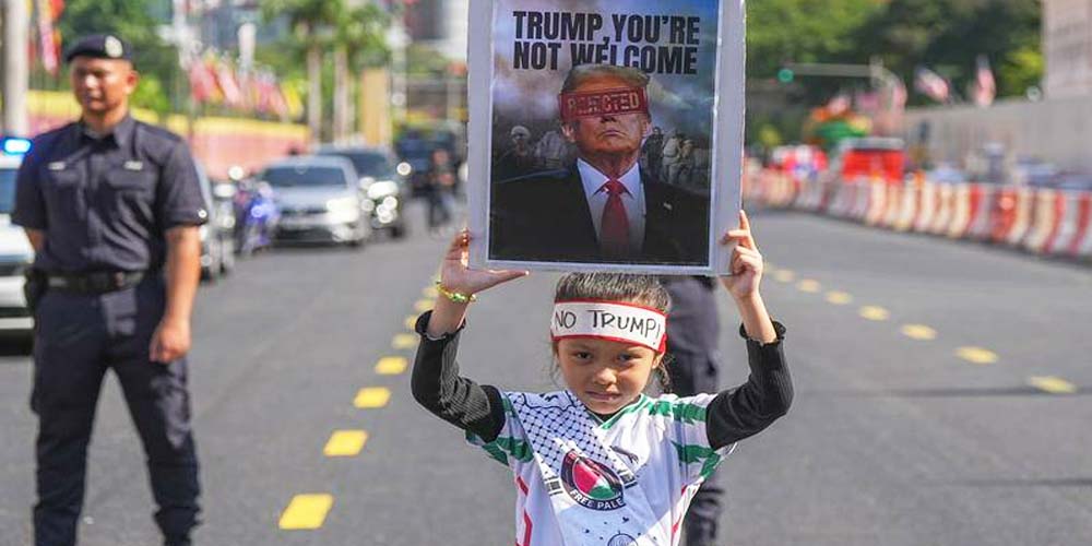 एजेन्सी । मलेसिया भ्रमणमा रहेका अमेरिकी राष्ट्रपति डोनाल्ड ट्रम्पविरुद्ध नाराबाजी भएको छ । मलेसियाको राजधानी क्वालालम्पुरमा ट्रम्पको विरोधमा र्याली आयोजना गरिएको थियो । प्रदर्शनकारीले प्यालेस्टिनी