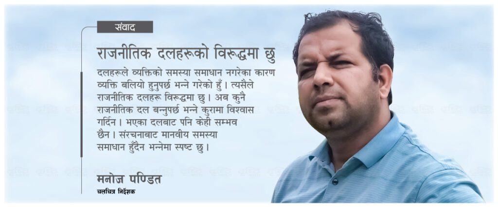 काठमाडौं । सिनेमा जगतमा परिचित नाम हो– मनोज पण्डित । ग्रेटर नेपाल, दासढुंगा, बधशाला जस्ता गम्भीर विषयमा सिनेमा बनाएका मनोज अब राजनीतिक यात्रामा छन् ।