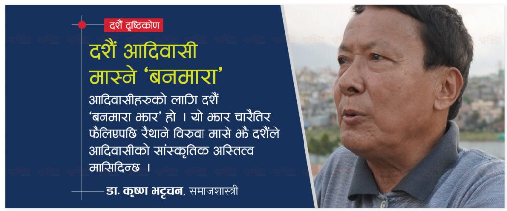 काठमाडौं । हिन्दू समुदायको चाड दशैंलाई लिएर समाज विभक्त छ । सिँगो राज्य पक्षपोषणमा लाग्दा गैरहिन्दु समुदाय त्यसमा पनि आदिवासी जनजातिले ‘बहिस्कार’ गर्दै आएका छन्