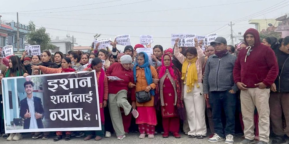 एजेन्सी । रुपन्देहीको कञ्चन गाउँपालिका-३ धौलागिरी चोकमा १७ वर्षीय ईशान शर्मा पौडेलको शंकास्पद मृत्युपछि स्थानीयले ईलाका प्रहरी कार्यालय रुद्रपुर घेराउ गरेका छन् । उनी र